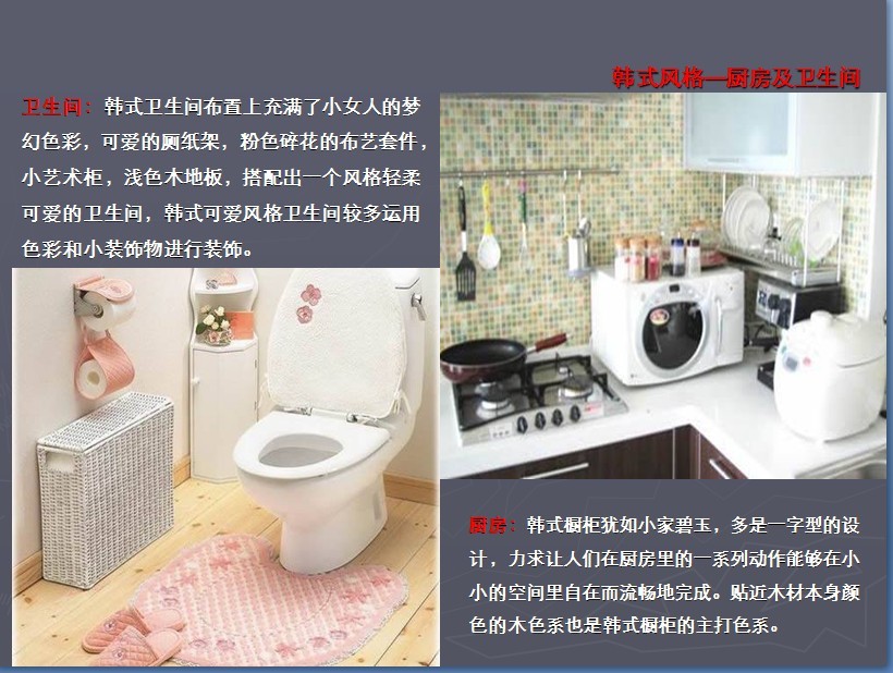 衛(wèi)生間:韓式衛(wèi)生間布置上充滿了小女人的夢(mèng)幻色彩,可愛的廁紙架,粉色碎花的布藝套件,小藝術(shù)柜,淺色木地板,搭配出一個(gè)風(fēng)格輕柔可愛的衛(wèi)生間,韓式可愛風(fēng)格衛(wèi)生間較多運(yùn)用色彩和小裝飾物進(jìn)行裝飾。