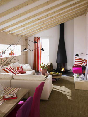 在房梁上加上一段弧形吊頂,能很好地緩解視覺上的壓迫感。另外,為天窗加上質(zhì)優(yōu)耐看的窗簾既能美化臥室意境,又能起到防風(fēng)遮光的效果。