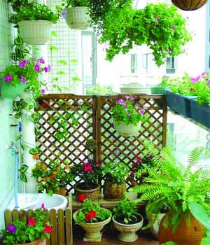 在陽臺上種花栽草也要有巧妙的搭配,否則其效果就會像野草一樣雜亂無章。陽臺的花草園地,既要便于澆水和管理,又要使各種花卉都能充分吸收到陽光?;ú莸姆胖靡灿性E竅,通常有鑲嵌式、垂掛式、階梯式和自然式四種?!拌偳妒健币话阌迷谝呀?jīng)裝修而且面積較小的陽臺上,利用墻壁鑲嵌特制的半邊花瓶式花盆,然后栽種觀葉植物?!按箳焓健笔怯眯∏删碌娜萜髟苑N吊蘭等小型植物,然后懸掛在陽臺頂板上。也可栽植藤蔓或其他有纏繞能力的觀葉植物懸掛在陽臺外?!半A梯式”是在陽臺內(nèi)搭起階梯,進(jìn)行立體盆花布置,一般的植物都可利用這種形式栽培?!白匀皇健崩藐柵_外的盆架栽種一些木本藤蔓植物,使植物自然下垂,形成一種自然景觀。