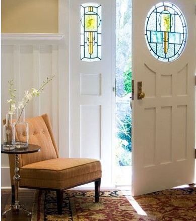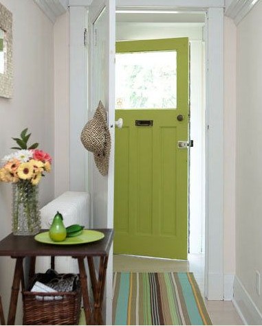 概要:   如何讓客人眼前一亮。如果你夠大膽,就讓色彩更加濃烈一些吧。          灰綠色給這個門廳增添了幾分娛樂色彩,并與地毯和桌墊的色彩相呼應(yīng)?!        ∵@個優(yōu)雅的門廳,墻壁是淡淡的金黃色,這既營造出一種溫馨的氛圍,又讓整個空間更加明亮?!        ∪绻銐蚰?,就讓色彩更加濃烈一些吧。這個樓梯間的墻壁被漆成了綠色與藍(lán)色,樓梯則鋪上了鮮紅的地毯。