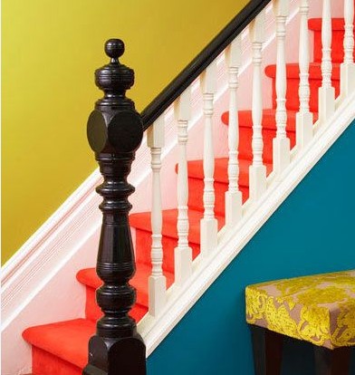 如果你夠膽,就讓色彩更加濃烈一些吧!這個樓梯間的墻壁被漆成了綠色與藍(lán)色,樓梯則鋪上了鮮紅的地毯。而白與黑的扶欄緩和了整個空間給人的沖擊。