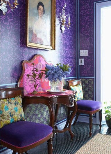 紫色花紋壁紙鋪貼的墻壁讓這個原本平庸的玄關(guān)變得引人注目起來。