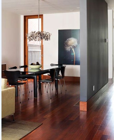 進(jìn)門后,過道與餐廳的分隔墻漆成了深灰色,讓這個通暢的開放空間更具立體感。