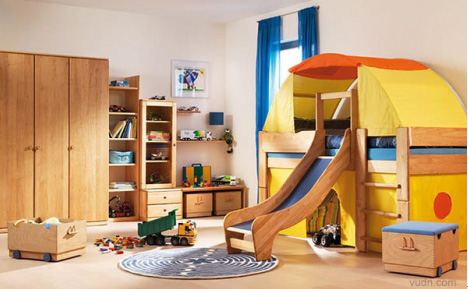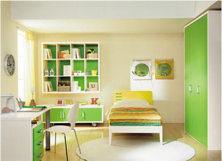 學(xué)齡前的房間中,為保證孩子的身體健康,兒童房中的家具都選用環(huán)保的實(shí)木家具,并鋪設(shè)實(shí)木地板。因?yàn)楹⒆幽挲g小,又好動(dòng),宜選用低矮的兒童床,以免孩子睡覺時(shí)“不老實(shí)”而翻下床。
