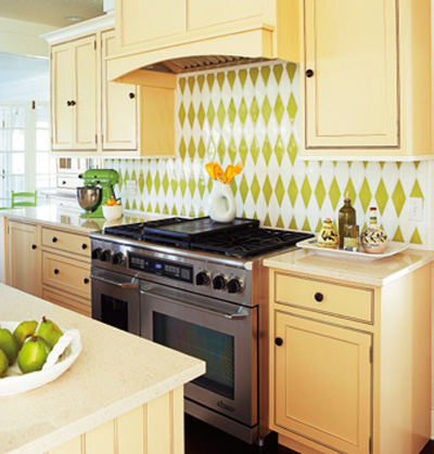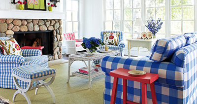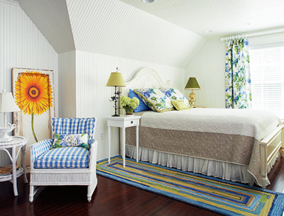 壁爐和窗邊休息區(qū)都是原來(lái)老房子的客廳里所沒有的,廢舊的走廊立柱經(jīng)過(guò)翻新矗立在壁爐兩側(cè)客廳中,條紋沙發(fā)帶來(lái)海洋氣息,幾個(gè)花朵靠包巧妙地迎合了夏日的特點(diǎn)。而廚房則更具清涼感,白色的抽油煙機(jī)頂飾和明亮的手工燒制瓷磚驅(qū)走了夏日的炎熱,加高的小吧臺(tái)是特意為孩子們準(zhǔn)備的早餐臺(tái),餐具柜里的花樣瓷器巧妙地裝飾了廚房。休閑區(qū)中團(tuán)花似錦,無(wú)論是地毯、靠包還是裝飾花都被花朵簇?fù)碇?,坐擁其中,更像是在花園中體味馨香。臥室的布置相對(duì)簡(jiǎn)單,藍(lán)色和粉色為主的布藝在白色背景的襯托下顯得格外美麗。