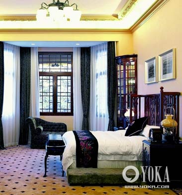 臥室的木雕床架是仿古典式樣的,刪除了不必要的繁瑣裝飾,僅僅保留了幾段有代表性的曲線造型。床頭創(chuàng)造性地放置了一個頗具年代的皮箱做裝飾,現(xiàn)代審美打造的古典空間也別有一番風(fēng)味。