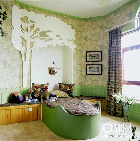 3 綠色的小床為特別訂制,獨特的船形能夠和背景墻很好的契合,同樣的木質(zhì)材料又如同是樹的延伸,從而成為房間的主體部分,營造出森林中的氛圍。