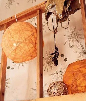 材料:藤球、彩色宣紙、干葉脈、膠、燈泡藤條編制的圓球,若貼上本色的干葉脈,便更顯清新自然;若貼上撒滿碎金箔的彩色宣紙,便有了一股東南亞的味道。家中幾個(gè)隨地滾動(dòng)的燈球,讓生活充滿快樂的氣息。
