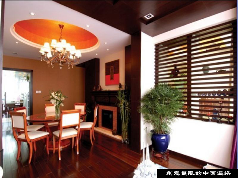 此套案例為中西混搭,脫去古板外衣的中式裝修,混入歐洲新古典的壁爐,餐桌椅,配以綠色植物,讓空間變得華麗而真實(shí)。
