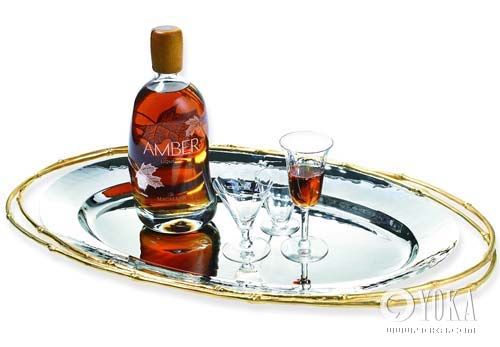 L’Objet公司的Evoca托盤為全手工打造。盤身材質(zhì)選用優(yōu)雅的黃銅和光彩奪目的鎳,耐用度和抗腐蝕能力絕對一流,托盤邊上鑲包著竹節(jié)形的雙重花邊,用料全部是24K黃金,而且每一只盤子的花邊紋路是完全不一樣的。 約¥2000/套 。