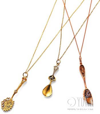17世紀(jì)歐洲貴婦吃冰淇淋用的勺子和18世紀(jì)王公貴族喝湯用的湯勺都成了項(xiàng)墜,這個(gè)創(chuàng)意來自Demitasse珠寶首飾公司。該公司原來還計(jì)劃推出餐叉和餐刀系列項(xiàng)墜,但考慮到安全和宗教因素,還是最終放棄了。 左起:約¥5000/件 ¥6500/件 ¥8000/件