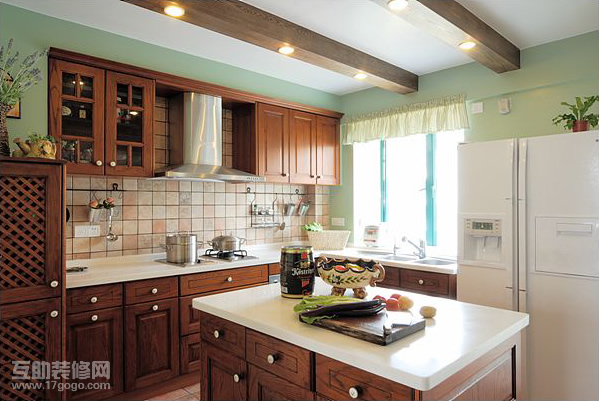影響廚房色調(diào)的主要因素是廚房家具。為了充分利用空間來(lái)發(fā)揮廚房的各個(gè)功能區(qū)的作用,采用的各種布局形式,都會(huì)占有墻立面醒目的位置。為各個(gè)工作中心的主要設(shè)施以及為之完善的配套家具,都有占據(jù)室內(nèi)空間的造型,所余空的墻面較少。因此,當(dāng)確定了這些家具的色調(diào)時(shí),也就等于確定了廚房的主調(diào)。天棚和地面等均可服從于家具的色調(diào)來(lái)選擇相應(yīng)的配色,以天棚和地面的配色協(xié)調(diào)于家具,或者等同于家具,地面還可以選用等同于墻面的色彩或放樣花飾來(lái)處理,會(huì)有延伸空間的感覺(jué)。