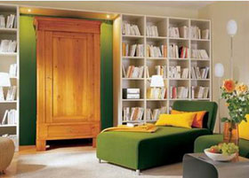 直接在松木地板上刷清漆后呈現(xiàn)的顏色略帶黃色調(diào),墻壁就運(yùn)用“相鄰顏色”的法則,可挑選與黃色相鄰的綠色、淡黃和淺綠的搭配,再加上幾件墨綠色的家具,用百葉窗擋住屋外刺眼的陽(yáng)光,屋內(nèi)一片柔和,是和朋友們輕松愉快地暢談的好處所!