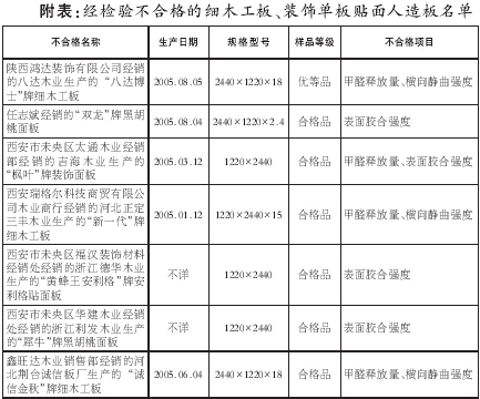 西安市質(zhì)監(jiān)局本次從部分銷售細木工板、裝飾單板貼面人造板的經(jīng)銷企業(yè)共抽查了23家受檢單位的37個生產(chǎn)企業(yè)的40個批次的樣品,合格率為60%。其中,細木工板合格率為77.27%;裝飾單板貼面人造板合格率為38.89%。在家世界、安美居、旺家旺等經(jīng)銷建材的超市抽樣檢查合格率為78.57%;在建材市場的抽樣檢查合格率為50%,這表明建材超市的產(chǎn)品質(zhì)量,優(yōu)于建材集貿(mào)市場的產(chǎn)品質(zhì)量。