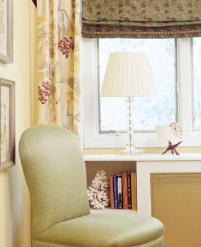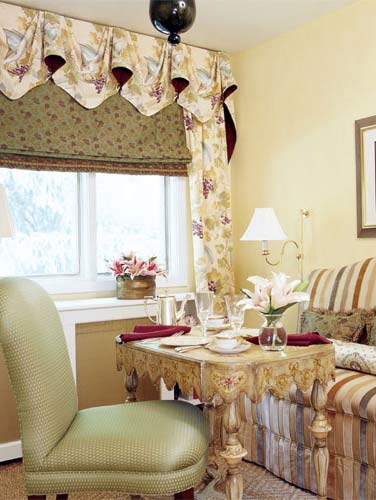 設(shè)計(jì)師通過(guò)一張沙發(fā)的圖案改變了整個(gè)餐廳的布置,條紋沙發(fā)雖然色彩豐富,但顏色略顯暗淡,于是,他將羅馬簾用亮麗的水果圖案來(lái)裝飾,并搭配了層疊的窗簾來(lái)強(qiáng)調(diào)層次,同時(shí)在色彩上也與羅馬簾呼應(yīng)。通過(guò)大量的布藝和精美的家具來(lái)裝扮出了一間不大但典雅的餐廳。