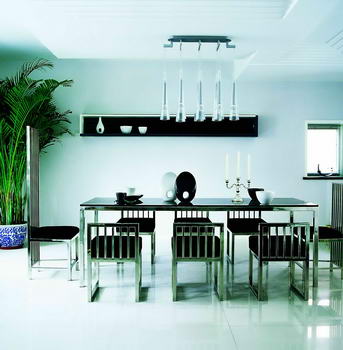 餐廳禮儀的考究程度實(shí)在了得,不銹鋼椅背的高低不容撼動(dòng)地將長(zhǎng)幼尊卑的秩序經(jīng)此奠定。角落里,漾出綠油油生命氣息的高大綠植多少平衡了餐廳的莊重感,緩和了黑白分明的極致。白方磚地面襯著墻上的黑色塊、黑椅面拼接著硬朗的金屬腿,使出落優(yōu)雅的黑白搭配顯得高貴與隆重。同色系的餐具系列,個(gè)個(gè)都是經(jīng)得起推敲的藝術(shù)單品。但它們的“集體光芒”仍掩飾不住歐式燭臺(tái)的精美古雅:其啞銀的基座,妖嬈的座身,可謂餐廳“理性基調(diào)中的一段華彩”。