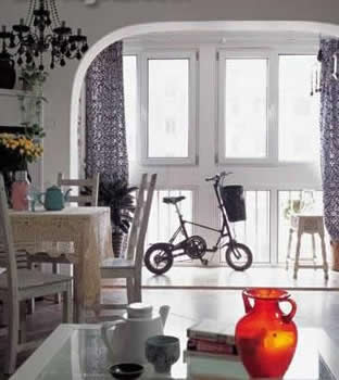 拱門(mén)外的陽(yáng)臺(tái)不會(huì)讓你一見(jiàn)鐘情卻說(shuō)不定會(huì)讓你流連忘返,碎花藍(lán)窗簾、綠色的小植物,簡(jiǎn)約小凳,會(huì)引得你忍不住要坐過(guò)去……