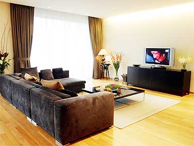 客廳有兩面大大的、面向陽臺的落地窗,使到原本寬敞的空間顯得更為明朗開闊。客廳內(nèi)選用的咖啡色意大利沙發(fā)和咖啡桌,舒適而富現(xiàn)代感,為了緩沖咖啡色較為沉重的視覺效果,地毯卻選擇了淺色調(diào)。