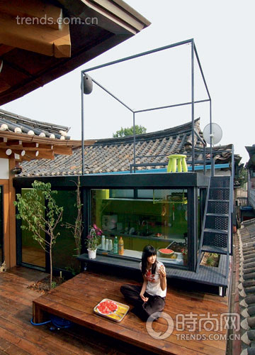 起居室內(nèi)保持了韓國傳統(tǒng)的臥地居住方式,地面的幾大塊凹槽和隔板就是他們的沙發(fā)和茶幾,同時(shí)也是用餐區(qū)域,這樣的設(shè)計(jì)大大節(jié)省了家具對(duì)于空間的占用浪費(fèi),同時(shí)也體現(xiàn)出了主人對(duì)于傳統(tǒng)生活方式的熱衷。起居室的后門一直通向庭院,這里的面積雖然不大,但是由于通過樓梯與天臺(tái)連接的方式,又一次有效地?cái)U(kuò)大了使用空間,使得這里成為家庭聚會(huì)最理想的場(chǎng)所。整個(gè)生活空間舒適而自由,延續(xù)了傳統(tǒng)的起居方式,同時(shí)也滿足了現(xiàn)代生活方式的需求。