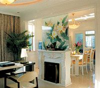 白色的壁柱嵌以黑色玻璃壁龕,壁柱上精致的雕花和復(fù)雜的曲線造就了雍容華貴的氣質(zhì)。這是元洲裝飾公司清風(fēng)工作室設(shè)計(jì)師江林生在本案中的出色設(shè)計(jì)。另外,設(shè)計(jì)師在壁爐上方用彩繪玻璃加以裝飾,為餐廳和過(guò)道形成了一個(gè)自然的屏風(fēng)。整個(gè)居室風(fēng)格自由、明朗、大氣。