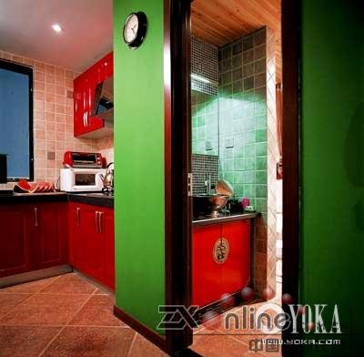 一墻之隔的廚房和衛(wèi)浴間通過(guò)色調(diào)取得了視覺(jué)上的統(tǒng)一
