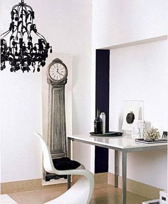 一條簡單的黑色長條色塊增加了角落的深度,本來容易被忽視的角落反而成為了居室里的亮點(diǎn)。其它配飾的選擇除了顏色非黑即白之外,最好選擇不同的材質(zhì)和質(zhì)地,這樣就會有既豐富又單純的效果。