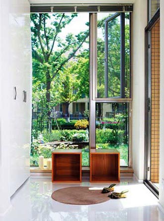 一間小的廚房間,由推拉門隔離。玻璃門上的白色樹枝圖案,與屋內(nèi)的白色統(tǒng)一一致。
