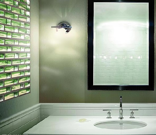 雙層霧玻璃磚墻因?yàn)榭梢蕴峁┝己玫牟晒庑Ч?,隔音、隔熱,?jié)約能源并有延續(xù)空間的感覺(jué),從而成為部分人裝修居室墻面的時(shí)尚選擇。其實(shí)在家庭裝修中,不論是單塊鑲嵌使用,還是整片墻面使用玻璃磚,都會(huì)有畫(huà)龍點(diǎn)睛的效果。