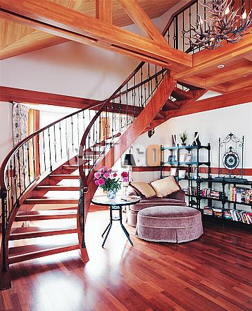 有了基本的基調(diào),設(shè)計(jì)師就開(kāi)始為Joe打造一個(gè)非常大氣、簡(jiǎn)潔的剛性空間。居室原有的高而隆的頂被保留下來(lái),用大量的原木圈邊,門(mén)沿也同樣用厚重木做包圍強(qiáng)調(diào);原本應(yīng)該是落地墻裙的地方也簡(jiǎn)化為墻體中間走邊;加上大廳中間旋轉(zhuǎn)上升不加雕飾的樓梯,整個(gè)空間結(jié)構(gòu)仿佛一曲沉穩(wěn)大氣又灑脫超然的樂(lè)曲,讓人感受到從遠(yuǎn)古傳來(lái)那未曾雕飾過(guò)的氣息,自然而樸實(shí)。