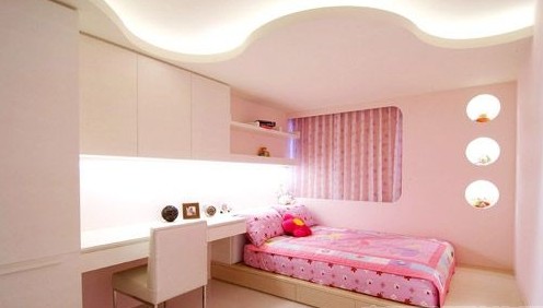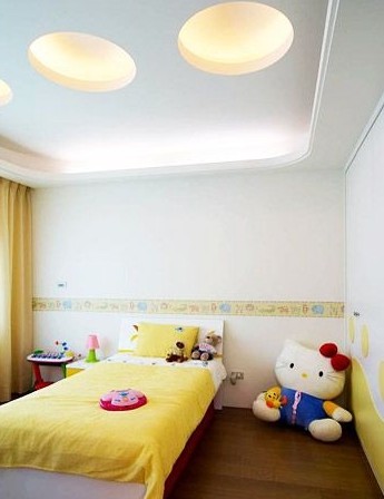 還在讀幼兒園的小女孩的房間利用線條顏色勾勒出小女生活潑的感覺,用曲線圓形來突顯兒童的趣味性,窗戶的設(shè)計(jì)也以弧度的轉(zhuǎn)角來修飾。