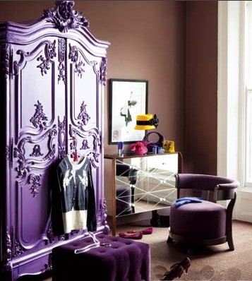 如果你是視覺沖擊力很強(qiáng)的色系的忠實(shí)擁護(hù)者,那么千萬不要錯過這個最奪目的房間造型。散發(fā)著珍珠光澤的紫色古典樣式衣柜,觸感舒適的絲絨沙發(fā)凳,搭配用鏡面裝飾的梳妝臺,制造出位的華麗效果。