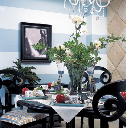 概要:   風(fēng)格進(jìn)階四步曲  1、增加家飾品為空間著色  進(jìn)一步的進(jìn)階佈置,可以從注入季節(jié)性色彩來著手;夏季就不免讓人聯(lián)想到海洋,因此保留塬有的白玉餐盤,運(yùn)用餐墊、檯布、餐具、食物等為空間著色,頓時(shí)藍(lán)X白的海洋風(fēng)LOOK便輕鬆地躍入眼簾,讓人彷彿正吹著徐徐海風(fēng),甚是宜人。這樣的進(jìn)階版,只要花點(diǎn)心思就能輕鬆達(dá)成喔。