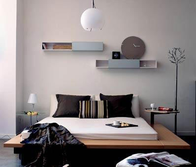 利落的線條充滿整個房間,原木色的寬邊床可移動的小幾設計周到,背景墻上錯落安置的CD架,利用材料的多元變化和幾何造型的有機融入,讓視覺呈現(xiàn)出舒緩的起伏,金屬衣架豎立要床旁,既實用又強調(diào)了空間的設計感。