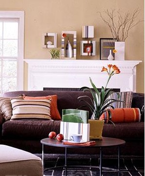 把墻面漆成可可色,整個(gè)空間立刻變得很有時(shí)尚味道,并且在壁畫(huà)、條紋沙發(fā)和地毯上也加入相同色彩的局部呼應(yīng),獲得視覺(jué)上的協(xié)調(diào)性。選擇粉色作為次配色,應(yīng)用在地毯、臺(tái)燈、靠墊上,不但可以中和可可色的深重,還能起到提亮空間色彩的作用。