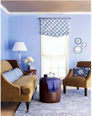 這間客廳使用了淺灰藍(lán)色,看起來(lái)溫和雅致。墻壁和天花板都刷上了淺灰藍(lán)色。大面積的運(yùn)用冷色調(diào)可以營(yíng)造溫雅舒適的感覺(jué)。甜蜜的藍(lán)白組合和深色的木制家具形成了強(qiáng)烈的對(duì)比。綠色沙發(fā)椅在藍(lán)色調(diào)客廳中醒目亮眼。