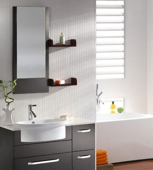 無論是在臺(tái)盆表面還是在浴室柜的臺(tái)面上,放過多的清潔衛(wèi)生用品都會(huì)顯得雜亂無章,而且容易碰倒,因此不妨在面盆上部貼墻的位置釘上10厘米寬的擱板,只要能放得下化妝瓶、刷子、洗漱杯等便可以了。擱板高度以不妨礙使用水龍頭為宜,材料可選用木板、玻璃等。