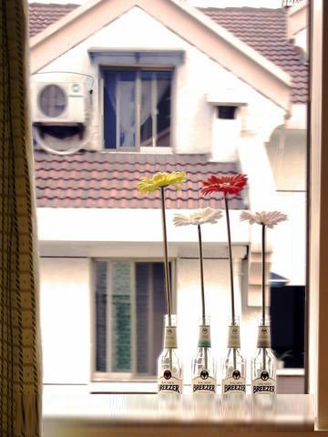 插花的瓶子是上回和朋友K歌時(shí),喝剩下的,覺(jué)得還漂亮,就帶回了家。