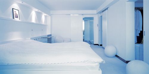 這是一間偌大的一色潔白的房間,白色的四壁,白色的床榻,白色的沙發(fā),白色的地毯盡管想到白色便會想到純潔,但白色同時也會給人以冷漠,拒絕,高不可攀的印象?,F(xiàn)在它不再是簡單的純潔,當(dāng)一襲黑衣的主人坐臥在寬大的床榻上時,白色是性感的。在一身休閑的主人與朋友傾心交流的時候,它不再是拒絕的色彩,白色是溫情的,此刻單一的白色被賦予了豐富的感情。
