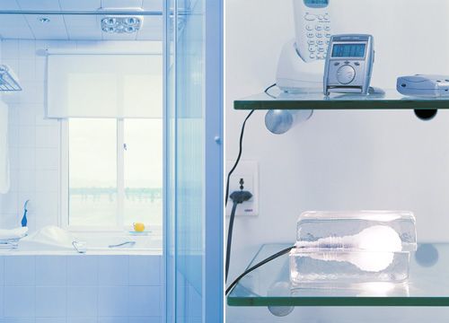 包裹在冰塊中的臺燈,白熾的柔光穿透冰層;托盤中靜靜佇立的四支蠟燭,承托著流著淚的燭花;一排灰白黑色調(diào)的照片,里面有誘惑的美女,有滄桑的老人,當(dāng)然還有令胡媽媽自豪的兩個兒子,只是他們都是含蓄的一個身影,相框統(tǒng)一而內(nèi)容豐富。這樣的亮點在每一個房間默默地散發(fā)著誘人的光彩。