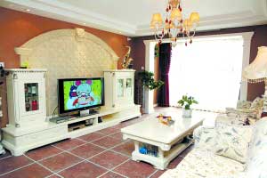 客廳的白色歐式家具、砂巖電視背景墻、剔透的水晶古典吊燈都在傾訴著歐洲文化的內(nèi)涵。