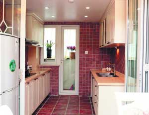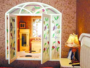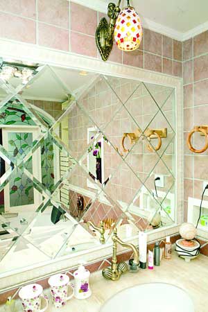 臥室里,凝重的壁紙,簡潔的吊頂,歐式石膏花線,卷葉的鐵藝花邊鏡面等讓臥室展示歐洲輕松的生活氣息(見圖五)。主臥衛(wèi)生間大開的拱形窗,色彩絢麗的內(nèi)絲玻璃,切邊菱形鏡面,規(guī)格精巧的瓷磚打造不一樣的衛(wèi)浴空間(見圖六)。這些既帶有一定浪漫色彩的裝飾,又不顯得老氣的簡歐式風(fēng)格正是劉戰(zhàn)勇夫妻的最愛。