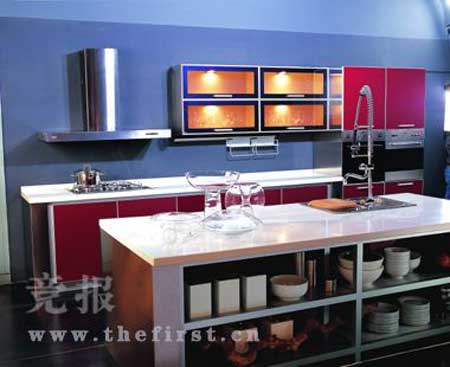 臺面:臺面是最容易被污染的地方,污物很容易滲透到臺面的縫隙里,留下無法徹底除盡的污垢。常見的臺面有人造石、石英石、大理石。人造石最大的優(yōu)點在于它是粘接打磨一體的無接縫安裝,不易劃傷,不易滲透,顏色選擇多種多樣,是臺面的首選材質(zhì)。在臺面設(shè)計上,盡量追求簡潔大方,減少復雜造型,尤其是臺面前沿和后擋水等容易藏污納垢的地方。