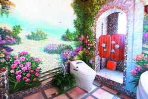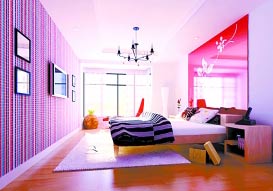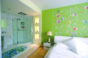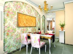 大花圖案目前引用在室內(nèi)裝飾中有幾種,一種是噴繪、手繪,手繪效果最好,但造價較高,很多人接受不了。而噴繪造價低一些,但可能沒有手繪那么有靈性。整個房間使用大花圖案時一定要注意,房間要夠大,花色要夠素,否則容易給人很燥很亂的感覺。