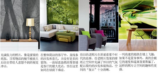 隨著各種“模仿”秀的不斷升級(jí),壁紙也緊跟時(shí)尚的腳步,仿照片效果的壁紙帶來了強(qiáng)烈的視覺沖擊力,把空間的裝飾效果推上頂點(diǎn)。