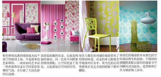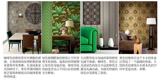 整體效果:壁紙的色彩十分廣泛,不同材質(zhì)的壁紙可以產(chǎn)生不同的色彩氛圍和質(zhì)感,紙基壁紙和PVC壁紙比較普遍,色彩眾多,容易清潔;而織物壁紙和植物壁紙?jiān)诹Ⅲw感的塑造上比紙基壁紙要略勝一籌,但是清潔起來比較麻煩,凹凸紋理的細(xì)節(jié)需要在保養(yǎng)上下一番工夫;其它的壁紙,如金屬壁紙、熒光壁紙可以產(chǎn)生一些特殊的效果來裝點(diǎn)房間。和絢麗色彩相映成趣的當(dāng)然是壁紙上的圖案,最常見的使用方法是在整體氛圍確定后,以局部點(diǎn)綴一些帶有花紋的裝飾圖案,把人的視覺重點(diǎn)自然地過渡到帶有圖案的墻面上,令鮮亮的色彩和各種圖案完美地融合在一起。