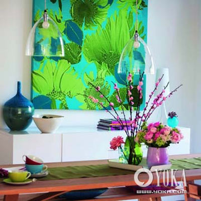 1.大的帆布畫,淡綠色和水藍(lán)色形成鮮明對(duì)比,給整個(gè)空間以視覺沖擊。