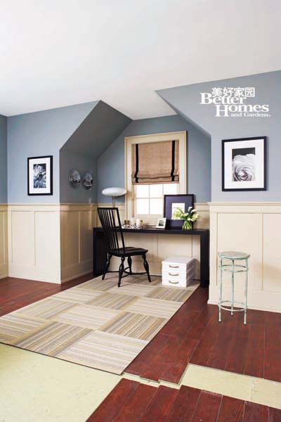 造型:從帶有鄉(xiāng)村味道的柵欄獲得靈感,將墻面的下半部鑲嵌上白色的木格圍板,同時(shí)在家具、布藝上也選擇條格相間的樣式。