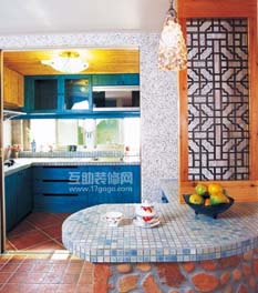 將廚房外的墻面整理出一陽臺,使廚房的空間不但光源充足,且視覺空間也可從廚房延展至餐廳及陽臺,搭配慣用的磁磚拼貼流理臺及中島型吧臺桌、餐桌,并大膽用印度藍染色方式處理木柜門面,并用窗欞做廚房隔屏,使整個空間營造出帶點中國風的地中海風格。