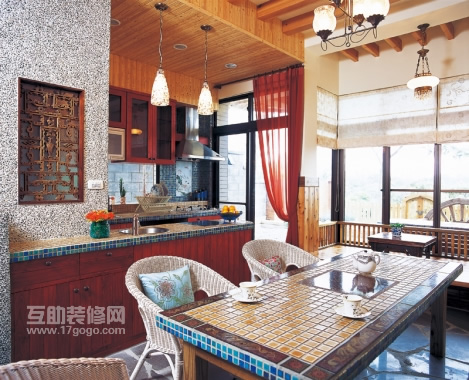 概要: 抱持「只要廚房空間美,任何人都會想在這空間大顯身手」的設(shè)計想法,設(shè)計師大膽地將國畫陶磚嵌在爐具臺面的壁面、將中國窗欞做成隔屏在吧臺上與廚房做視覺區(qū)隔、將各式各樣的磁磚拼貼在操作臺面上或餐桌臺面上、具有特色的燈具設(shè)計…等等。
