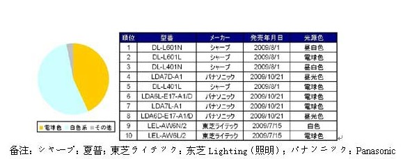 暢銷結(jié)構(gòu)方面,則大體上呈現(xiàn)出電球色及白色系平分秋色的態(tài)勢。其中電球色燈泡銷量約占43%,白色則約占54%。品牌方面,夏普DL-601N、601L、L401N三款產(chǎn)品分別位居暢銷榜第1~3位;DL-L401L位居第5位。Panasonic公司LDA7D-A1(第4位)、LDA7L-A1(第7位)等4款產(chǎn)品名列前10。東芝照明LEL-AW6N/2、LEL-AW6L/2則名列第9、10名。